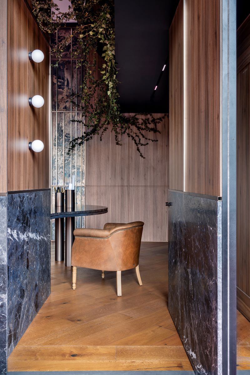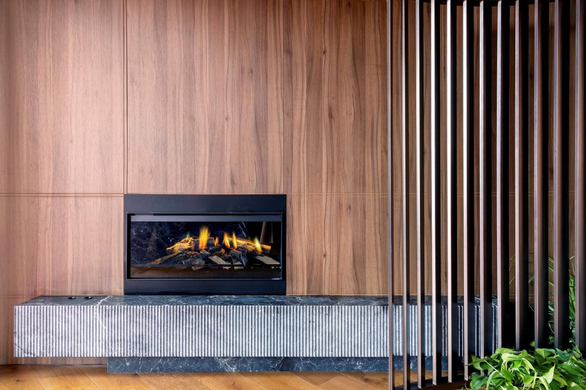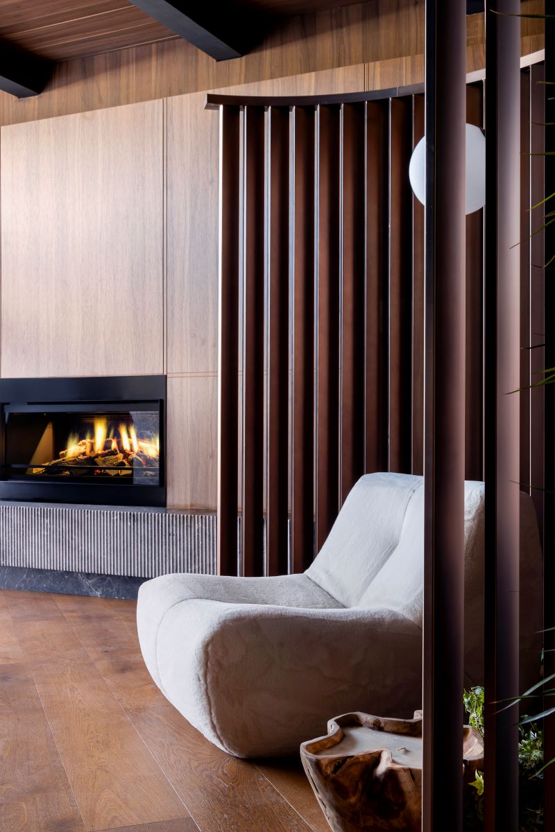 La madera es el patrón principal sobre el cual hemos proyectado el espacio. Como un traje a medida, los paramentos verticales y horizontales quedan modulados con un esquema de cerrajería y fresados enmarcando la piedra, trabajada de distintas formas. La artesanía queda abrazada de nuevas tecnologías con innovadores sistemas de retroiluminación y techos tensados, simuladores de fuego y la domótica para aumentar la sensación de un espacio confortable.