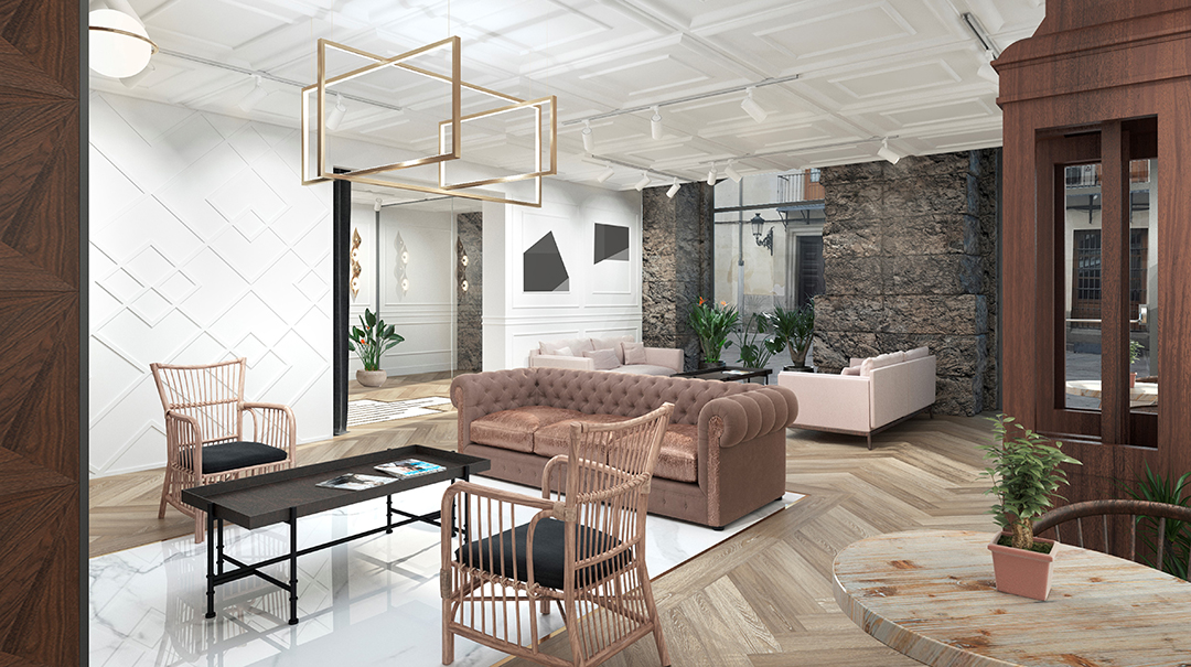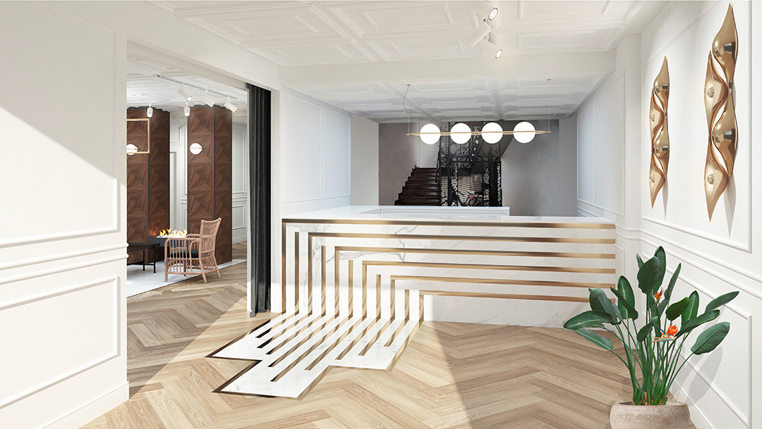 El diseño depurado de acento clásico genera un gran impacto visual nada más entrar. Para ello se han buscado contrastes dramáticos y efectistas. El primer ejemplo es el mostrador de recepción, de líneas depuradas, que alberga una perfilería dorada que de forma metafórica nos traslada a épocas pasadas de gran esplendor.