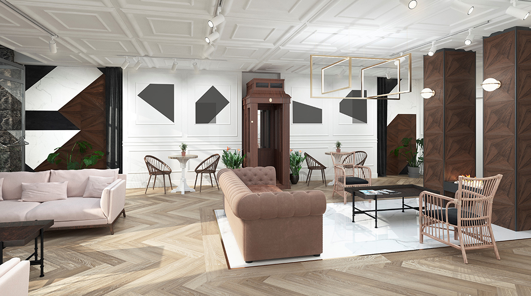 Se trata de un proyecto 360º. El campo de actuación engloba paramentos verticales y horizontales con el fin de potenciar la arquitectura y generar un gran impacto visual. A través de despieces de paneles, se genera una atmósfera de estilo contemporáneo, donde el diseño geométrico de éstos convive con el clasicismo de los elementos decorativos. Las tramas de los suelos zonifican los espacios cobrando especial protagonismo la alfombra de recepción, que refleja la esencia de la base proyectual.