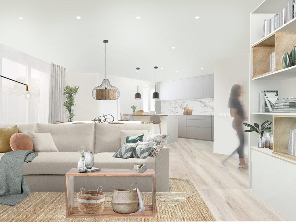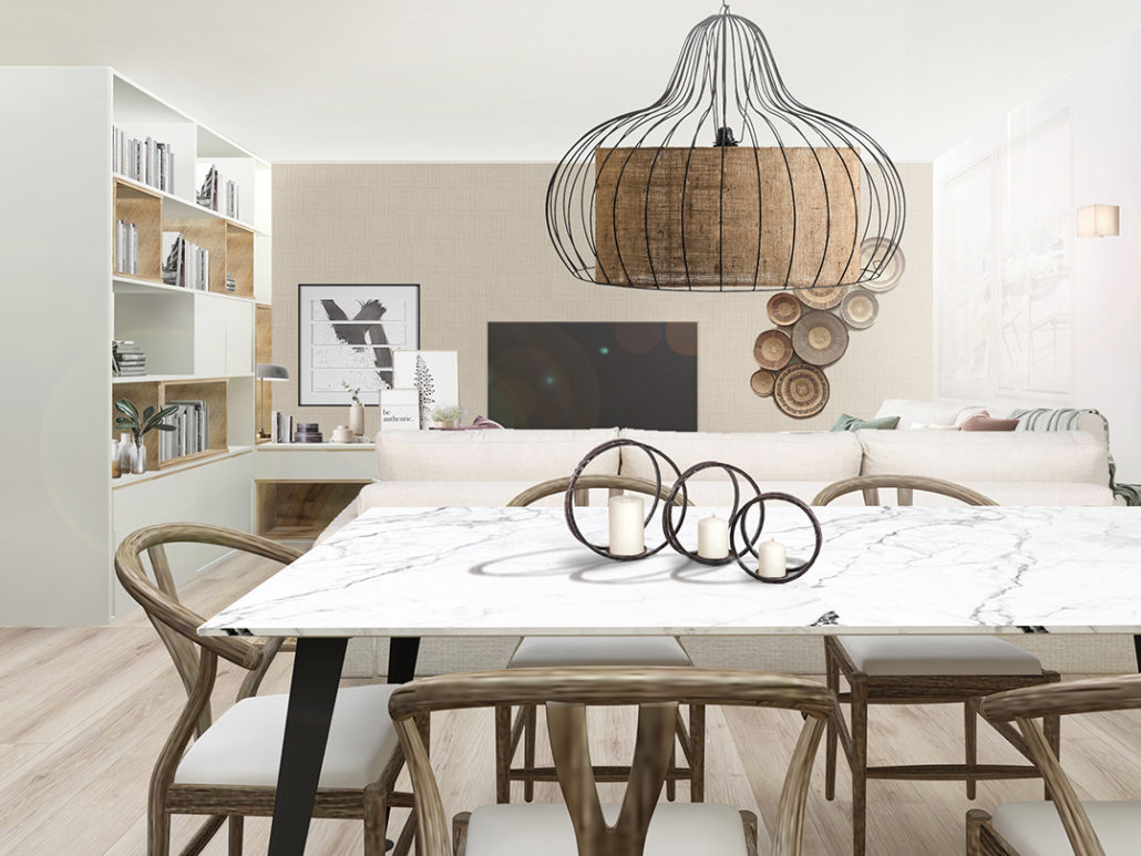 La mezcla de los tonos cálidos y los tonos fríos componen este diseño de interior. Proyectamos la distribución teniendo como punto de referencia la orientación de la vivienda. La luz natural, que incide en todas sus habitaciones y se acentúa gracias a la cromática elegida, nos guío para zonificar las distintas estancias. Propusimos un concepto abierto de cocina integrada con el salón-comedor para así conseguir un espacio lleno de luz, un espacio lleno de vida.