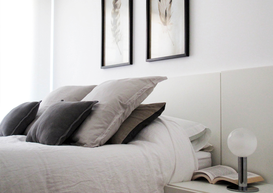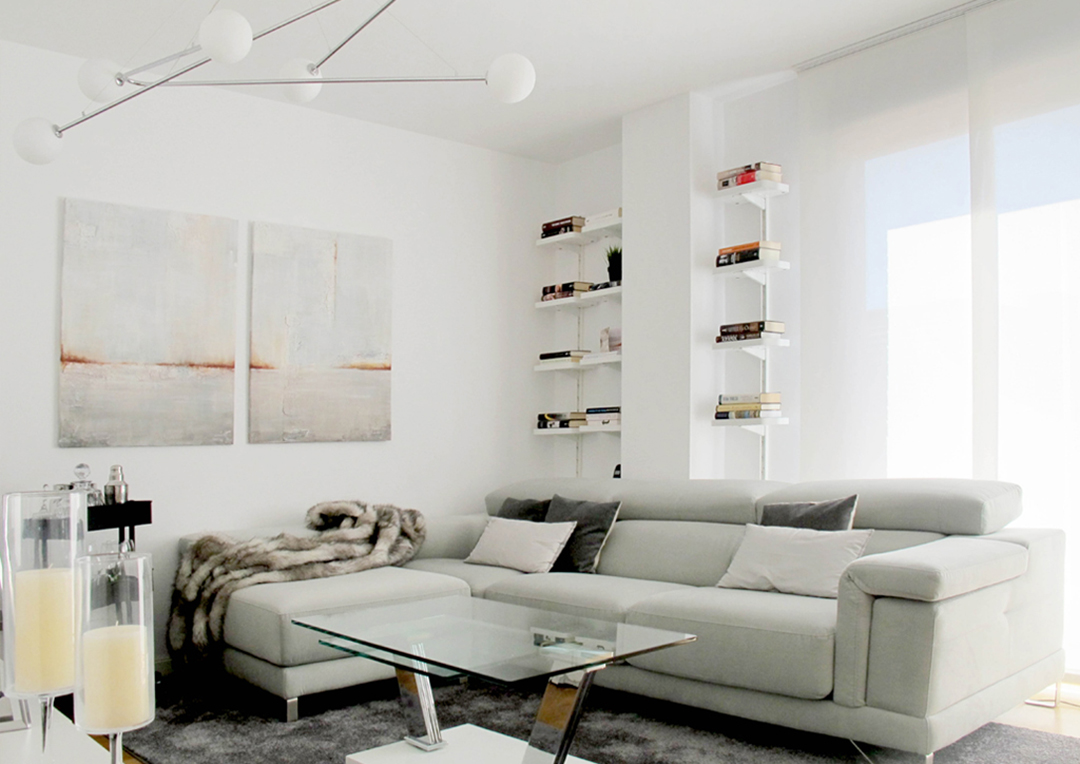 El interiorismo de la vivienda destaca por su cromática blanca, característica del estilo, con toques grises y colores tierra. Esto potencia la luz natural que tiene la vivienda y contrasta con los toques sutiles de grises oscuros en algunos detalles de decoración y con su suelo en madera oscura.