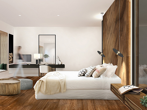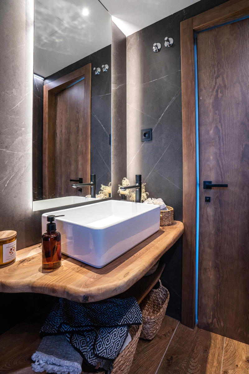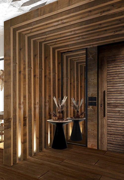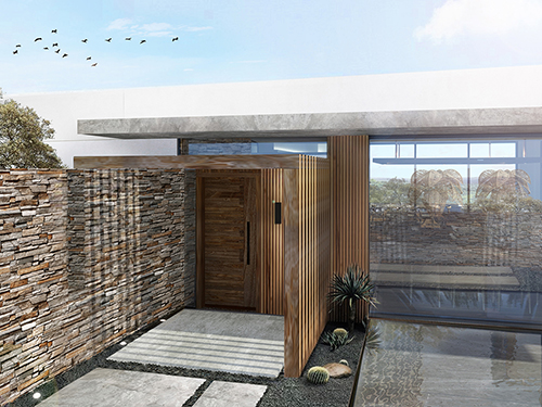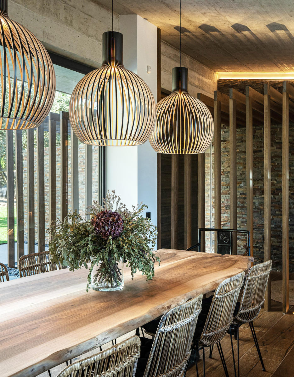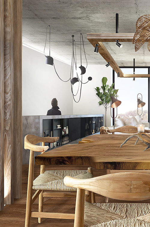 Se trata de un hogar con sumo carácter, todos los paramentos de la vivienda están concebidos como una escenografía. El principal actor a destacar en su arquitectura es su techo de hormigón visto a dos aguas, siempre tratado con especial mimo, se hace un estudio de iluminación que hace parecer que esta gran losa está levitando. El diseño interior de la vivienda presume de tonos suaves y a la vez contrastados, cálidos y atemporales, siempre acogidos por nuestro material estrella: la madera.