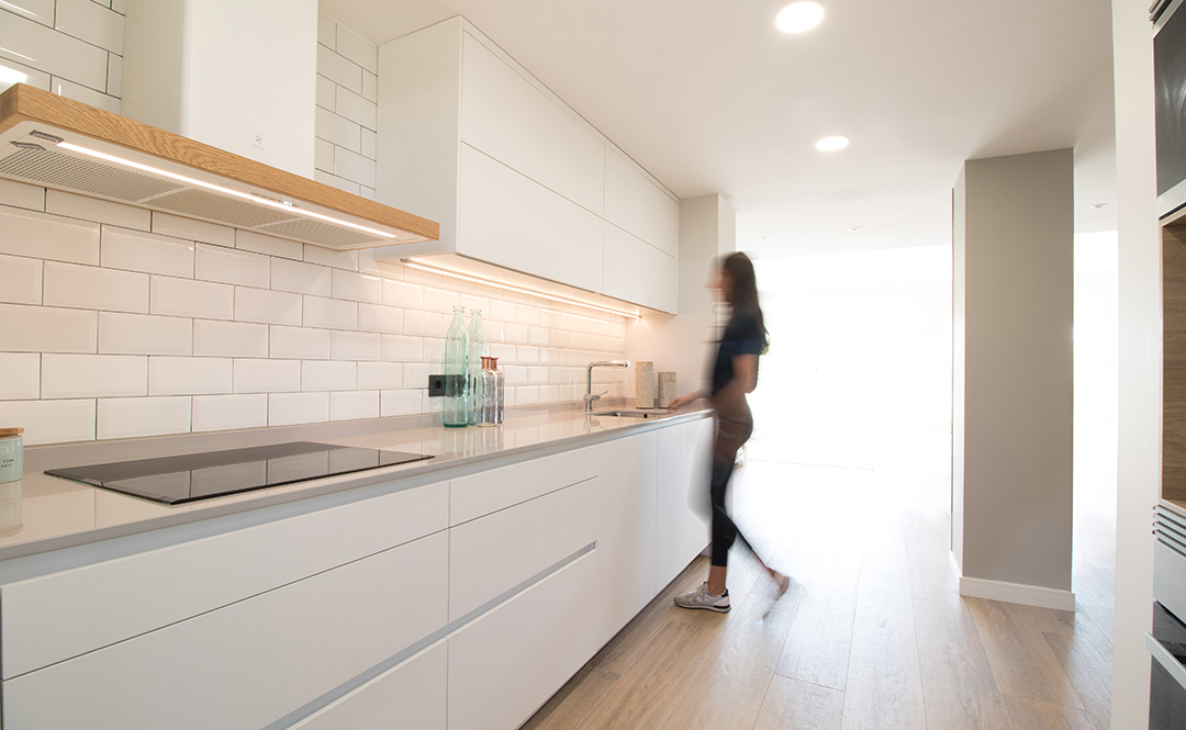 Evitamos las circulaciones cruzadas para poder aprovechar al máximo los metros de salón-cocina y que ambas zonas quedaran conectadas. De esta manera, ganamos metros y lo más importante en la zona de día de la casa, ganamos luz natural, algo que no puede faltar en estas estancias de la vivienda.