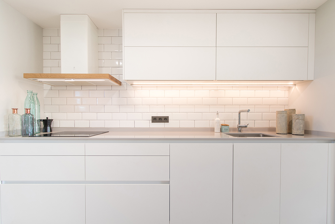 En cuanto a los materiales, elegimos una gran variedad: maderas rústicas, lacas, porcelánicos con una excelente imitación madera, Solid Surface, vidrio… manteniendo la misma mirada, fresca y armoniosa. El diseño interior queda acompañado por un mobiliario sencillo con puertas discretas, que dan vida a una vivienda minimalista con contrastes en maderas creando un espacio cálido y luminoso.