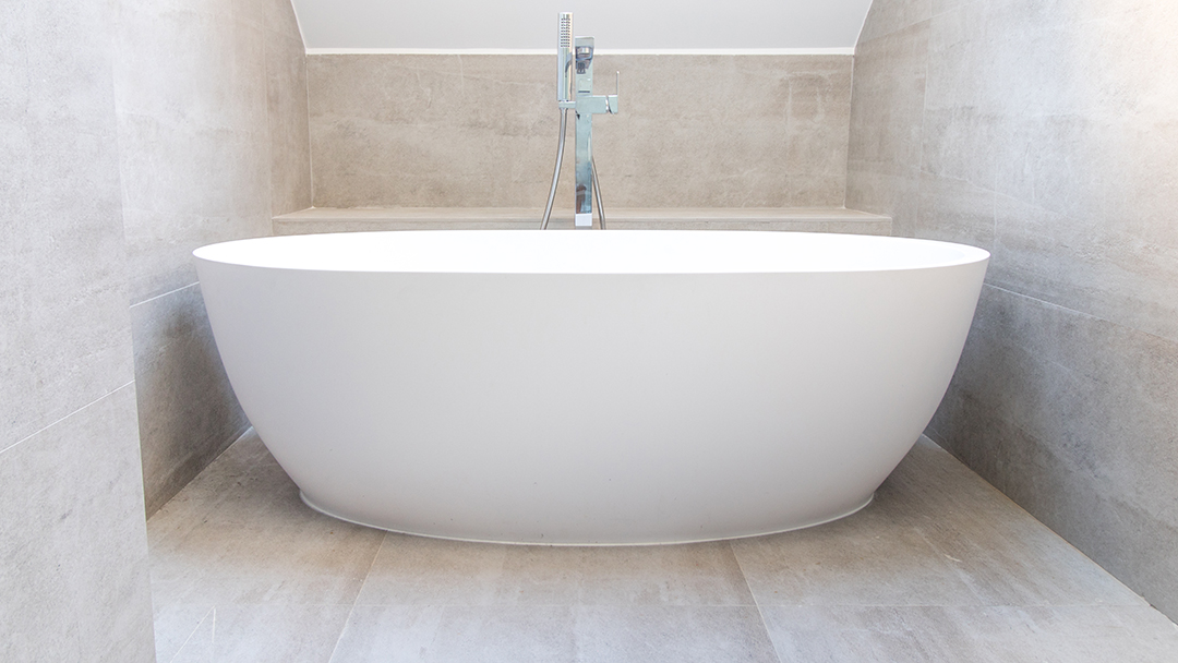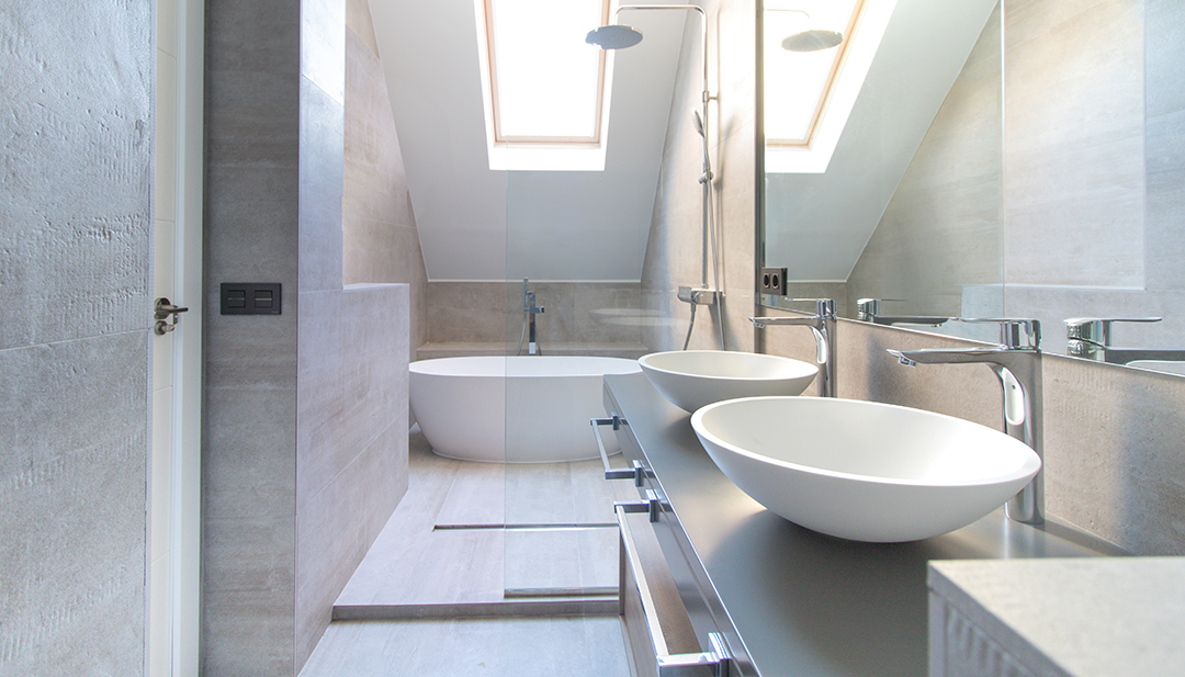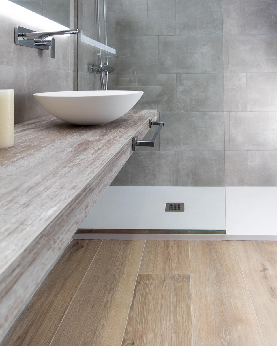 En la planta superior del ático, donde se encuentra la suite principal, destaca un espacio creado con un cariño especial. Un baño de grandes dimensiones en el que los lavabos de sobre encimera parecen tener vida propia. Pero por encima de todo, la bañera de cascara de huevo, integrada en un amplio plato de ducha, captan la atención de cualquiera que se adentre en el espacio.