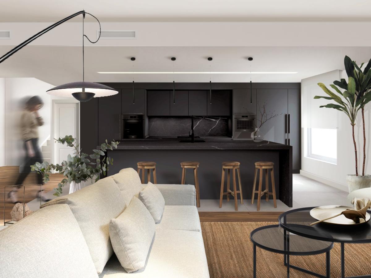 La cocina, protagonista de la vivienda, aporta un toque minimalista, que, al estar abierta, puede apreciarse desde el salón. Sus muebles de líneas puras y cuidadas aportan fuerza y estética. Todos sus electrodomésticos quedan perfectamente integrados cuidando la imagen que proyecta, creando un claro ejemplo de simbiosis entre funcionalidad y diseño.