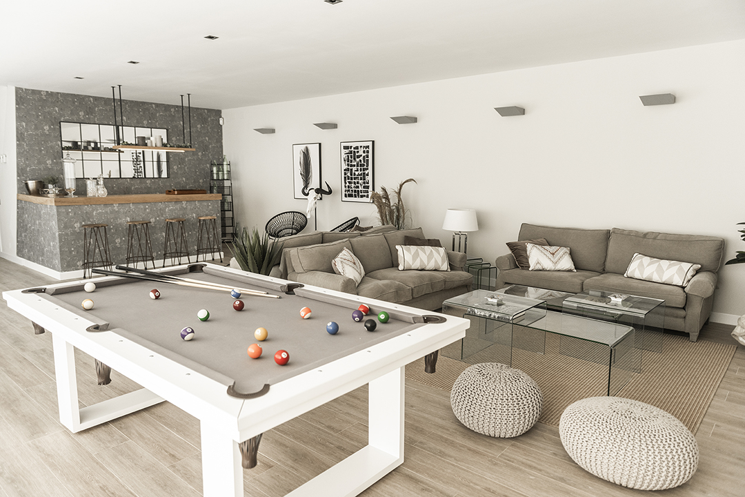 En esta vivienda abarcamos distintas estancias; El hall de entrada, acogedor que distribuye las estancias posee una mezcla de rustico industrial, dividiéndolo en zona de asiento y dejar abrigos y zona de consola; El salón, estancia luminosa en tonos neutros con pinceladas de color en sus cojines y decoración incorporada en los estantes; El comedor, reúne hasta 10 comensales, con mezcla rustico y moderno, contrastando con una cocina de líneas minimalistas en la cual una cristalera forjada, que da el carácter industrial, deja ver al salón; El jardín, con mobiliario minimalista y de líneas muy marcadas, lo dividimos en distintas zonas de uso: comedor, zona de estar y solárium; La sala de copas, 84 metros cuadrados destinados al ocio, dividido en distintas estancias: zona de estar, barra de bar, billar, zona de juegos, baño y ropero. Aquí predomina mezcla de estilos con espejos y papeles pintados.